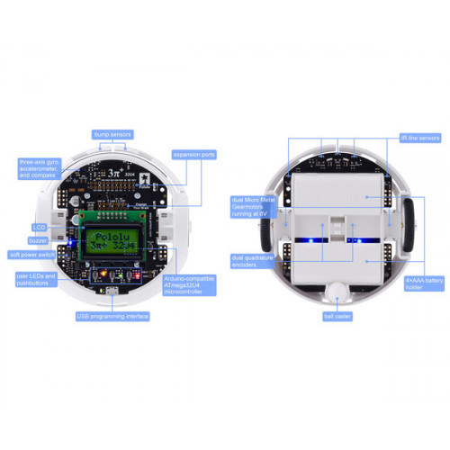 The 3pi+ features two H-bridge motor drivers and a variety of integrated sensors, including a pair of quadrature encoders for closed-loop motor control, a complete inertial measurement unit (3-axis accelerometer, gyro, and magnetometer), five downward-facing reflectance sensors for line-following or edge-detection, and left and right bump sensors along the front face of the robot. Three on-board pushbuttons offer a convenient interface for user input, and an LCD, buzzer, and indicator LEDs allow the robot to provide feedback.