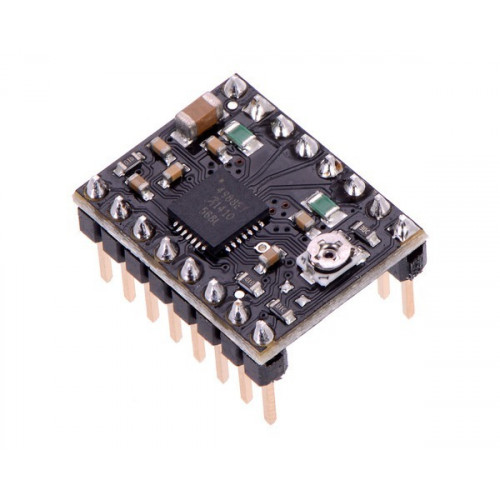 This is a bulk-packaged version of our Black Edition A4988 Stepper Motor Driver Carrier that ships with 0.1″-pitch male header pins installed as shown in the main product picture, so no soldering is required to use it with an appropriate 16-pin socket or solderless breadboard. Please see the Black Edition A4988 Stepper Motor Driver Carrier product page for more information about the driver.