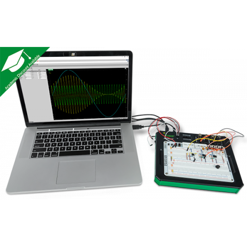 The Analog Discovery Studio is a fully functional, portable test and measurement device that can turn any cross-functional space into a pop-up electronics laboratory. Equipped with 13 instruments, including an Oscilloscope, Logic Analyzer, Spectrum Analyzer, Waveform Generator, and more; the Analog Discovery Studio provides an entire stack of bench-top instruments with a convenient, replaceable, and breadboardable interface, perfect for enabling student learning anywhere!