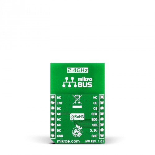 nRF T Click is an add-on board in mikroBUS form factor. It features Nordic nRF24L01P 2.4 GHz transceiver module with an embedded baseband protocol engine as well as 2.4 GHz PCB trace antenna. The board supports an air data rate of 250 Kbps, 1 Mbps and 2 Mbps and it is suitable for ultra low power designs. Typical applications include wireless PC peripherals, remotes, VoIP headsets, game controllers, sensors, home and commercial automation, active RFID, toys, etc. nRF C Click™ communicates with target board microcontroller via mikroBUS™ SPI (SDI, SDO, SCK, CS#), CE and INT lines. The board is designed to use 3.3V power supply only.