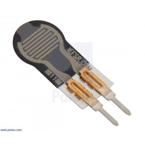 This force-sensing resistor (FSR) from Interlink Electronics is a passive component that acts as a variable resistor, with resistance decreasing in response to increasing applied force, which makes it easy to add a touch interface to your project or create a robot with much more sophisticated tactile senses than are possible with simple lever switches. The polymer thick film (PTF) device is optimized for use in human touch control of electronic devices and can sense an applied force anywhere in the active area ranging from a few dozen grams to a few kilograms (0.2 N to 20 N).