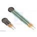 The 0.3″-diameter circular pad is flexible, light (0.1 g), and extremely thin (0.01″), and it has a circular active sensing area with a diameter of 0.25″. It does not appreciably compress when pressure is applied, and it has a masked adhesive backing for easy mounting. The FSR has two male pins (called “solder tabs”) spaced 0.1″ apart, which means they are compatible with most solderless breadboards and perfboards, though the solder tabs are too short to work well with many 0.1″ connectors. (A very similar FSR with a slightly smaller active area and a much longer tail is also available; see the picture on the right for a side-by-side comparison of the two versions.)