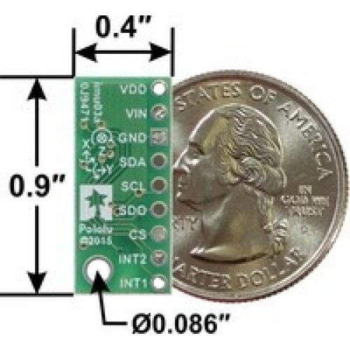 This board is a compact (0.4″ × 0.9″) breakout board for ST’s LSM6DS33 inertial module, which features a 3-axis digital linear accelerometer and 3-axis digital rate gyroscope; we therefore recommend careful reading of the LSM6DS33 datasheet (1MB pdf) before using this product. The LSM6DS33 is a great IC, but its small package makes it difficult for the typical student or hobbyist to use. It also operates at voltages below 3.6 V, which can make interfacing difficult for microcontrollers operating at 5 V. This carrier board addresses these issues by incorporating additional electronics, including a 3.3 V voltage regulator and level-shifting circuits, while keeping the overall size as compact as possible. The board ships fully populated with its SMD components, including the LSM6DS33, as shown in the product picture.