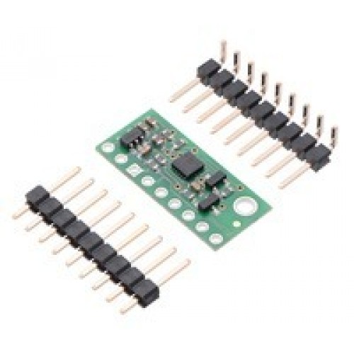 The LSM6DS33 combines a digital 3-axis accelerometer and 3-axis gyroscope into a single package. The sensor provides six independent acceleration and rotation rate readings whose sensitivities can be set in the ranges of ±2 g to ±16 g and ±125°/s to ±2000°/s, available through I²C and SPI interfaces. This LSM6DS33 carrier board includes a 3.3 V voltage regulator and integrated level shifters that allow operation from 2.5 to 5.5 V, and the 0.1″ pin spacing makes it easy to use with standard solderless breadboards and 0.1″ perfboards.