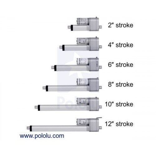 To test-drive the actuator, simply connect a power source of up to 12 V to the motor leads. Reversing the applied voltage will reverse the direction of motion. A motor controller or motor driver is required for electronic speed and direction control. We recommend our Jrk G2 21v3 or Jrk G2 24v13 motor controllers for use with the feedback actuators (see below for more information on this) and the Pololu Simple Motor Controller 18v7 for controlling the actuators without feedback, though many of our other motor controllers and motor drivers are capable of powering this actuator.