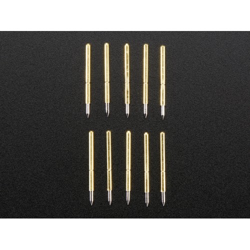 Pogo pins are little spring-loaded contacts, very handy for making jigs, or making momentary (but electrically solid) contacts. We use them by the dozen for making programming and testing jigs but they're handy also if say you want to JTAG program a board that you cant solder headers to - just shove these thin contacts into a 0.1" pitch IDC programming cable and press it onto the contacts.