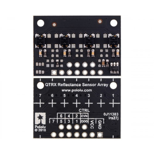 Two different sensor options are available, denoted by “QTR” or “QTRX” in the product name. The “QTR” versions feature lower-cost sensor modules without lenses while the “QTRX” versions feature higher-performance sensor modules with lenses, which allow similar performance at a much lower IR LED current. You can see the two different sensor styles in the pictures below of the 4-channel modules: